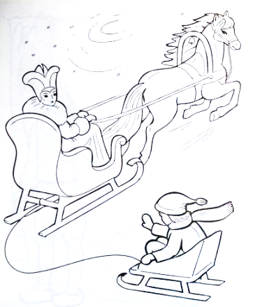 | «Сани дважды объехали площадь, а Кай живо прицепил к ним свои салазки и покатил». |
