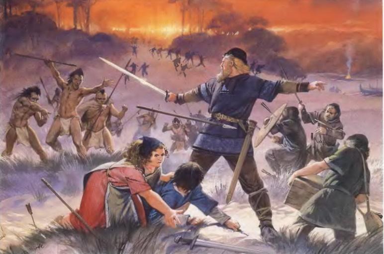 Битва викингов со скрэлингами в XI столетии. Главной причиной провала попыток викингов обустроить постоянные поселения в Северной Америке, совершенно очевидно, заключались в их враждебных взаимоотношениях со скрэлингами, как называются в сагах индейцы, а также и эскимосы без проведения какого бы то ни было различия между ними. Антропологи предположительно определяют этих самых скрэлингов как представителей вымерших индейцев мисинаков, или беотуков, родственных алгонкинам. Скрэлинги, воздействие которых способствовало в итоге исчезновению поселений викингов в Гренландии, являлись эскимосами, а не индейцами.