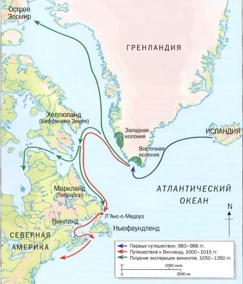 Согласно письменным источникам, викинги ходили в Новый Свет около 1000 года. Исландские саги повествуют о подвигах Лейфа Эриксона, вождя гренландских викингов, который добрался до страны, названной им Хеллуландом (что в переводе с древнескандинавского означает «земля каменных плит»), после чего отправился на юг в некий Винланд.