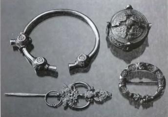 Репродукции предметов личного обихода викингов в Центре посещений в л’Анс-о-Медоуз, в состав которых входят булавки для плащей и браслеты. Не так уж много подлинных артефактов сохранилось в местах оригинальных поселений