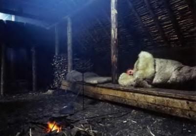 Интерьер дерновой хижины викингов — реконструкция в л’Анс-о-Медоуз. На переднем плане видны элементы очага, где готовили пищу.