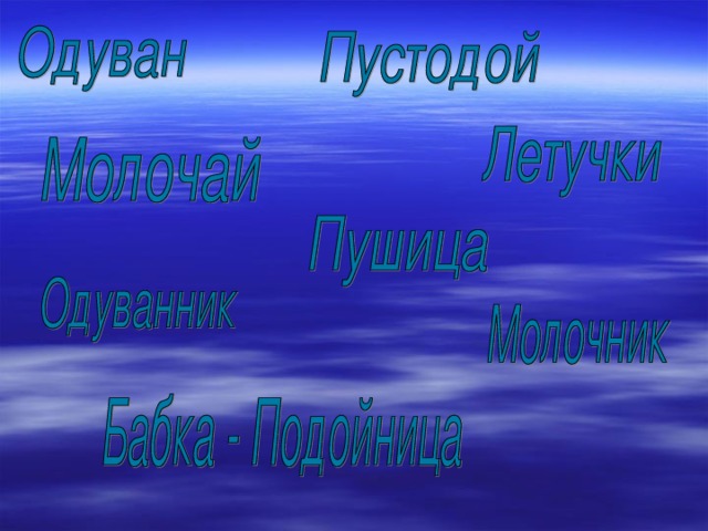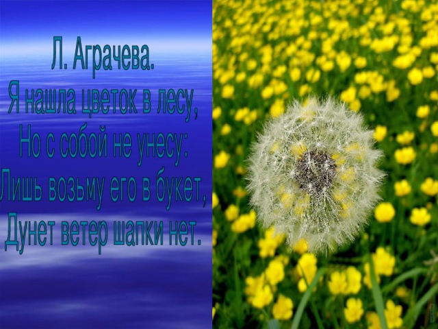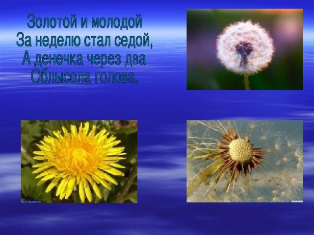 - Однажды Южный ветер увидел далеко в северных равнинах юную золотоволосую девушку и полюбил её. Каждый день он любовался золотыми волосами девушки и мечтал о встрече. Но был робок и леноват и всё откладывал путешествие на север. А однажды утром он увидел, что побелели золотые косы девушки. Решил Южный ветер, что это его брат, Северный ветер, украл у него невесту и посеребрил её волосы. Горестно вздыхал Южный ветер, и от его вздохов белым пухом, словно снегом, наполнился воздух, и юная дева навсегда скрылась с глаз. Так и не узнал Южный ветер, что не девушку он любил, не о девушке мечтал, а всё лето любовался золотым одуванчиком, который и развеял в поле своими вздохами.