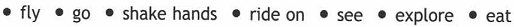 Disneyland Paris is a perfect choice for a fun day out. You can 1) _________ the big wheel,2)_________ in a pirate ship 3) _____clowns performing tricks, 4) _____with cartoon characters and 5) ____a haunted mansion. And, of course, 6)_________ souvenir shopping and 7)_________candy floss.