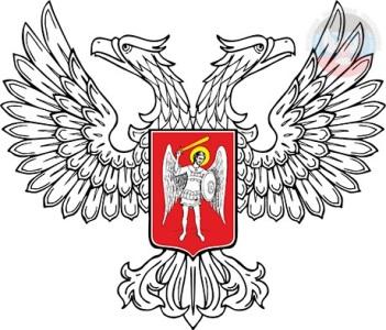 - Герб ДНР представляет собой серебряного двуглавого орла, поднявшего вверх распущенные крылья. На груди орла – в щите Святой Михаил в серебряном одеянии и вооружении, чёрной мантии, с лазоревым мечом и серебряным с золотыми краями щитом с золотым крестом. Особенностью герба ДНР является то, что лапы у орла отсутствуют.