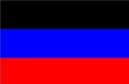 - Посмотрите на флаг. Прямоугольный флаг горизонтально разделён на две равные части. Верхнее поле - лазурное, нижнее - чёрное. В центре флага нанесено золотое изображение малого герба Донецка.