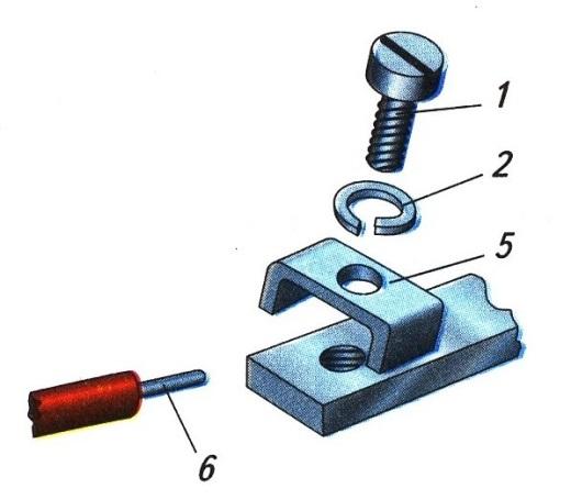 Некоторые винтовые зажимы имеют скобы (рис. 73, б), которые предотвращают выбрасывание провода при закручивании винта. Такая конструкция позволяет не делать колечка на конце провода и упрощает крепление его в зажиме.