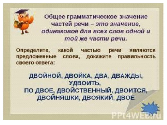 Общее грамматическое значение частей речи - это значение, одинаковое для всех слов одной и той же части речи.