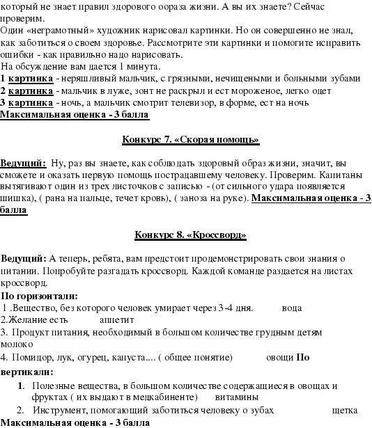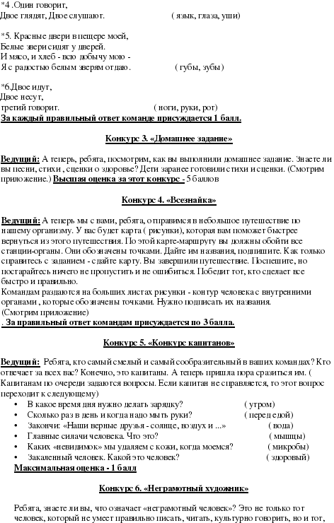 Ведущий: Все ,ребята, молодцы! Показали, что, действительно, знаете свой организм и знаете, как сохранить его здоровым! Желаю вам всем быть здоровыми! А теперь подведем итоги и посмотрим, кто у нас победитель! Подсчитываются баллы. Объявляются победители. Команды награждаются витаминами.