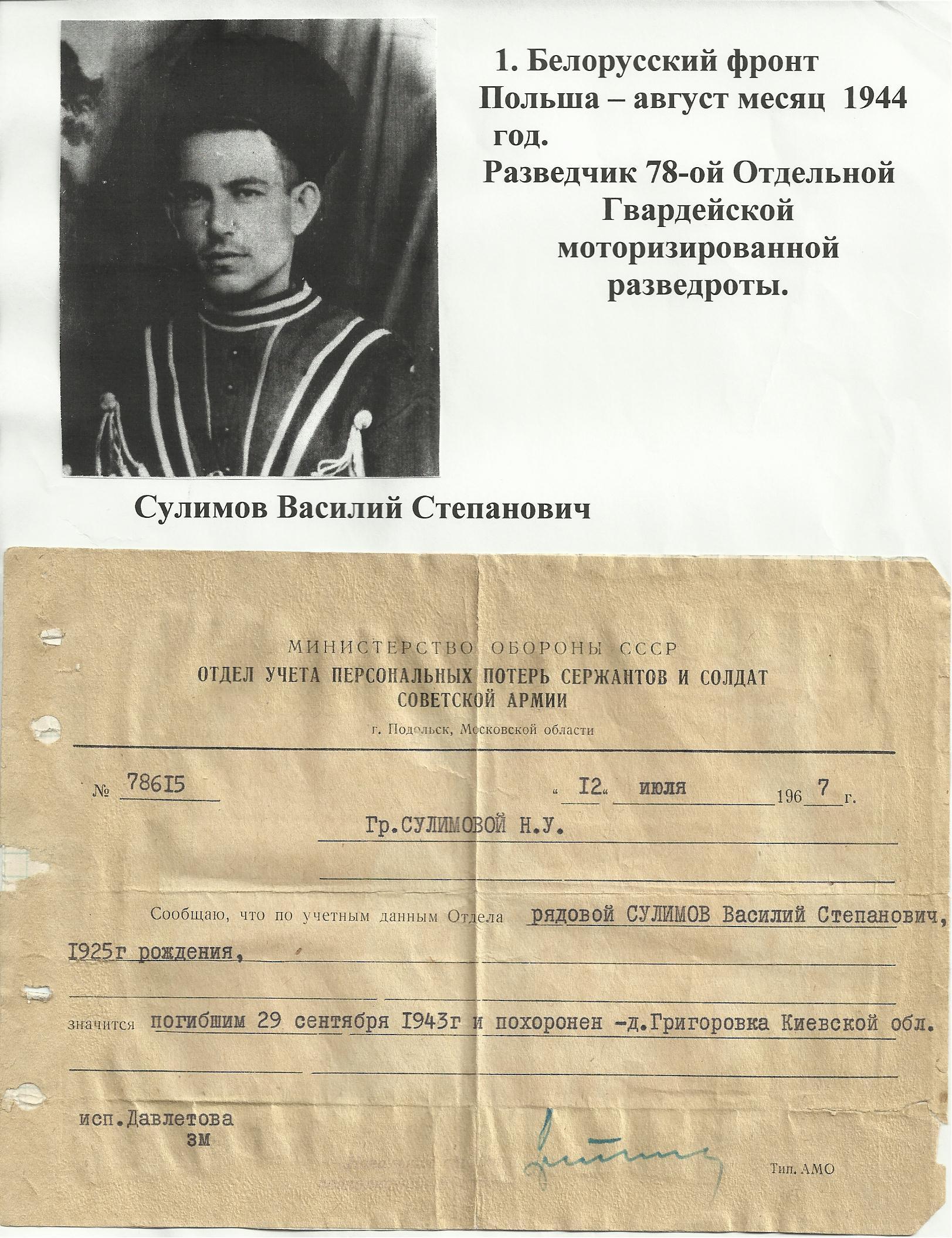 Я и мои одноклассники проводим экскурсии в школьном музее «Комната Боевой славы» и собираем информацию об односельчанах воевавших на фронтах Великой Отечественной войны и войны в Афганистане. И вот во время очередной работы в «Комнате Боевой славы» моё внимание привлекла фотография солдата одетого не в солдатскую форму, а одетого в необычную форму (как на старинных фотографиях казаков царской армии). Рядом лежала похоронка в которой говорилось, что «Рядовой Сулимов Василий Степанович, 1925 г. рождения значится погибшим 29 сентября 1943 г. и похоронен в д. Григоровка Киевской области». Я захотел узнать побольше об этом солдате. И я решил обратиться к основателю музея Бабушкиной Нине Трофимовне которая много лет проработала в нашей школе учителем истории и сейчас находится на заслуженном отдыхе, надеясь , что она мне поможет найти ответы на мои вопросы. Нина Трофимовна радушно приняла меня и рассказала много интересного, оказалось, что Сулимов Василий Степанович не погиб, а получил тяжелое ранение и чуть не был похоронен с погибшими в одной могиле. Об этом в центральной газете в 1975 году была опубликована заметка «Дважды рожденный» в которой было рассказано о Сулимове В.С. А сейчас я расскажу об этом поподробнее.