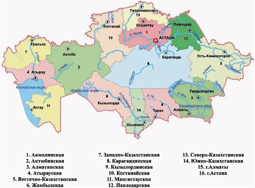 | (К) Актуализация знаний. Целепологание. - Викторина «Казахстан». - 1. Какой праздник в Казахстане отмечают 22 сентября? (День языков) 2. Назовите знаменательную дату, которую отмечает Казахстан 1 декабря? (День первого президента) 3. Какой язык в Казахстане является государственным? (Казахский) 4. Основной закон государства? (Конституция) 5. Как называют знатока многих языков (Полиглот) 6. Наш президент Н. А. Назарбаев поставил перед нами задачу говорить на 3-х языках, На каких? (Казахский, русский, английский.) 7. Птица, которая изображена на флаге? (Орел) 8. Священная книга у мусульман? (Коран) 9. Как называется верхняя сводная часть юрты? (Шанырак) 10. Государственные символы республики Казахстан? (Флаг, герб, гимн) Работа над лексической и грамматической темой урока. (П) Формулирование темы и цели урока. (К) Работа с учебником. -Вспомните. Казахстан - независимое государство. Республика Казахстан расположена в центре Евразии. Население страны составляет более 18 миллионов человек. Столицей нашей страны является город Астана. Все мы любим свой родной край. Узнайте в словаре значение слова край. Своим краем человек называет страну, область, город или село, где живёт. (И) Работа с картой. - Рассмотрите административно-территориальную карту нашей страны. - Какую информацию можно получить, изучая её? - На какие единицы разделена территория нашей страны? Назовите эти территориальные единицы, покажите на карте. Наша страна делится на 17 административно-территориальных единиц. Это 14 областей и 3 города республиканского значения - Астана, Алматы и Шымкент. В 2018 году население Шымкента достигло 1 миллиона человек. Шымкент стал третьим городом республиканского значения. Центр области был перенесён в город Туркестан. На карте появилась Туркестанская область. (П) Работа в парах. -Как вы думаете, почему город Туркестан стал центром области? - Найдите и покажите на административно-территориальной карте столицу нашей страны. Расскажите, что вы знаете об Астане. Города республиканского значения. Астана Алматы Шымкент (И) Работа с картой. - Найдите на карте область, где вы живёте. - Какой город является административным центром вашей области? - Что вы можете рассказать об областном центре своего края? - С какими другими областями граничит область, где вы живёте? (К) Физминутка. Попишите, почитайте, Поднимитесь, пошагайте, Покричите, помолчите, Потанцуйте, постучите, Помашите, потянитесь, Поморгайте, улыбнитесь, Посидите, пошепчите, Успокойтесь, подремлите… А теперь все поднимайтесь И за дело принимайтесь. Первичное закрепление с проговариванием. (Г) Работа в группах. Внимательно изучите иллюстрацию и расскажите, чем знамениты разные области Казахстана. Подумайте, может ли область делиться на более мелкие административно - территориальные единицы (И) Работа с учебником. В свою очередь каждая область имеет свои более мелкие административно-территориальные единицы - районы. (К) Пальчиковая гимнастика Каждый пальчик разотру, Каждый пальчик покручу… Разведу вперед, назад… И сожму их сильно. Здравствуйте, пальчики, Зверушки лесные! Здравствуйте, пальчики, Игрушки заводные! (П) Работа в парах. Изучите карту области вашего проживания. Расскажите, какие районы входят в её состав. Узнайте, чем они знамениты. (И) Самостоятельная работа по закреплению изученного материала. -Ответь на 