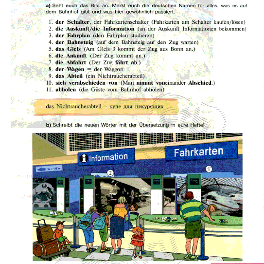 а) Was seht ihr hier? (с. 177-178 – рисунок вокзала с обозначениями) Определить объекты вокзала по данным обозначениям от 1 до 11 и словам от 1 до 11.