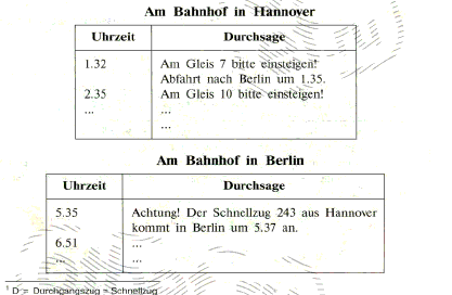 b) Какие объявления можно услышать на вокзале в Ганновере? А в Берлине? Добавьте новые объявления к уже имеющимся в образцах. Запишите их. Готовность сигнализируем цветными карточками (красная – готов, синяя - есть затруднения, жёлтая – помогите)