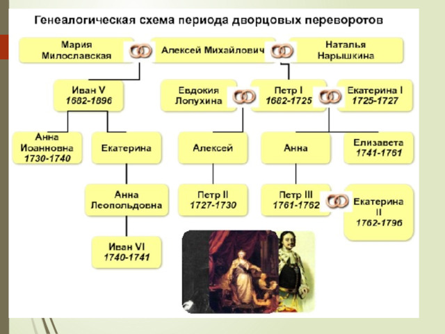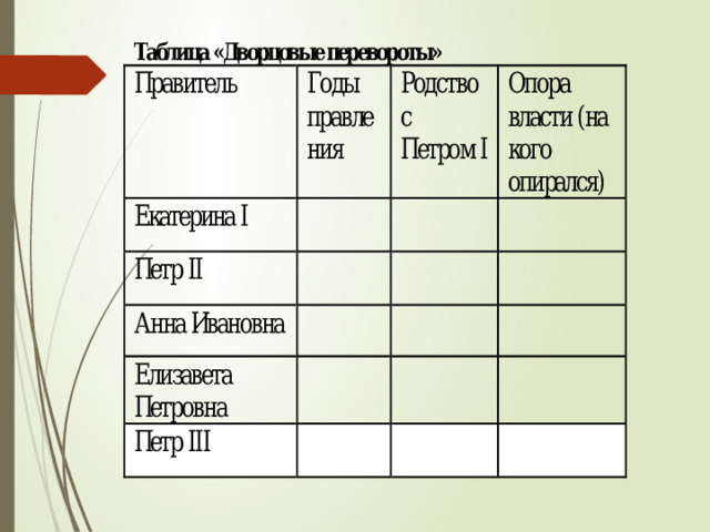 План урока: 1.Причины и сущность дворцовых переворотов XVIII века; 2.Ход переворотов (заполнение таблицы); А) Екатерины I / 1725-1727. Б) Петра II / 1727-1730. В) "Верховники" / 1730. Попытка ограничить абсолютную власть российского монарха. Г) Анна Иоанновна / 1730-1740. Бироновщина. Д) Иван Антонович / 1740-1741. Е) Императрица Елизавета Петровна / 1741-1761. Ж) Петра III / 1761-1762.