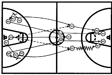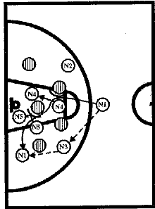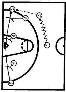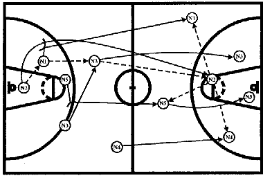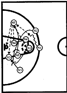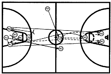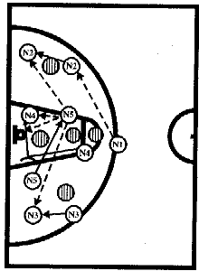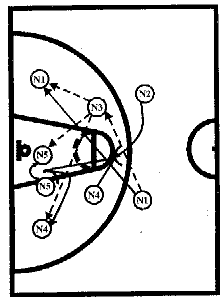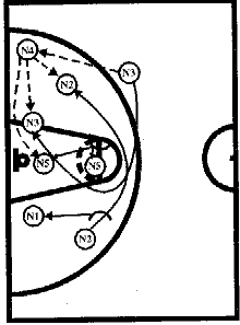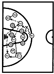 #1, получив мяч от #2, отдает его #3, который после заслона от #5 выходит влево от центрального круга. Затем #1 ставит заслон для #2, который на скорости устремляется к щиту соперника, ему следует пас от #3. #1 и #4 готовы с двух сторон для атаки. #3 и #5 вторым эшелоном устремляются к щиту, или получают мяч для атаки, или участвуют в борьбе за отскок после бросков #1 или #4.
