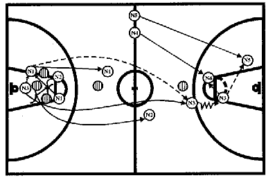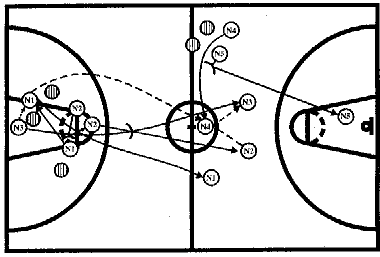 #2 выпускает #1 с заслоном на штрафной линии, сам открывается после заслона влево на 3-4 м и тут же отдает мяч #1 для ведения через центр. #3, #4 и #5 рвутся к щиту соперника для атаки и, получая мяч от #1, бросают по кольцу.