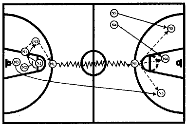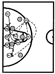 11) при проведении комбинации против зонной защиты, требующей концентрации игроков на одной из сторон поля, следует помнить о том, что в этом случае подбор мяча будет легче осуществить с противоположной стороны, т.к. зона всегда смещается в сторону мяча.