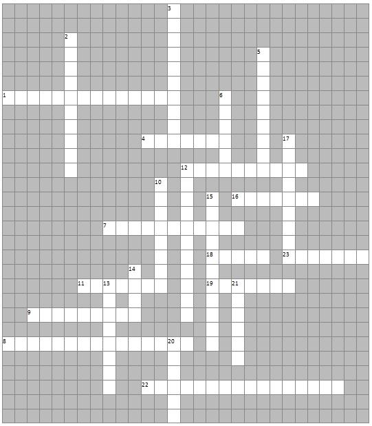 По горизонтали: 1.Часть речи, отвечающая на вопросы какой? какая? 4. Служебная часть речи, не употребляющаяся самостоятельно. 7. Падеж, отвечающий на вопросы кого? чего? 8. Часть речи, отвечающая на вопросы Кто? Что? 9. Изменяемая часть слова. 11. Часть слова, стоящая после корня. 12. Главный член предложения, отвечающий на вопросы кто? что?. 18. Знак препинания, выражающий законченность мысли. 19. Наука, изучающая значение слова. 22. Наука, изучающая способы образования слов. 23. Фонетическая форма письменности, состоящая из 33 знаков.