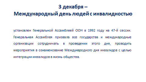 | 3 декабря – Международный день людей с инвалидностью, главной задачей которого является привлечь внимание общества к необходимости оказывать помощь и поддержку людям с ограниченными возможностями здоровья. Вопрос: Какие средства есть у государства и общества для этого? |