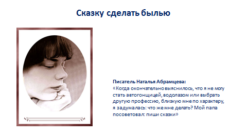 | Писатель Наталья Абрамцева Сказки Натальи Абрамцевой необычны, как и её судьба. Первую половину своей жизни до двадцати лет она могла только сидеть, вторую – только лежать. И ещё писать. С 1990 года член Союза писателей. Написала более 120 сказок, 12 пьес. В 1985 году была издана первая книга. Всего вышло 16 книг. Сказки переводились на испанский, японский, немецкий языки, по ним созданы диафильмы и мультфильмы. |