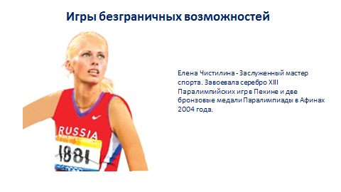 | Спортсменка Елена Чистилина Заслуженный мастер спорта. Завоевала серебро XIII Паралимпийских игр в Пекине и две бронзовые медали Паралимпиады в Афинах 2004 года, неоднократно побеждала на чемпионатах России. В 2006 году спортсменка Указом Президента России награждена медалью ордена «За заслуги перед Отечеством» II степени. О встрече паралимпийцев – победителей Олимпиады в Сочи – можно прочитать, пройдя по ссылке http://www.aif.ru/olymp2014/paralympic/my_hoteli_podarit_vam_ulybki_v_ sheremeteve_vstretili_paralimpiycev Видеозапись: https://youtu.be/A_iKv5BGkKQ |