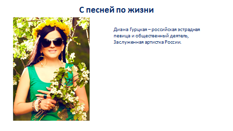 | Артистка Диана Гурцкая Российская эстрадная певица и общественный деятель. Заслуженная артистка России. Видеоклип https://www.youtube.com/watch?v=x643AVSU1l8 |