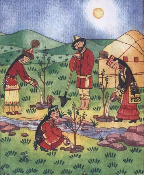 Бір тал кесең, он тал ек- дескен қариялар бұлақбасына тал егеді. Ал әйелдер атып келе жатқан Күнге тәу етіп, “Армысың қайрымды Күн-Ана!”, - деп иіліп сәлем береді және кеудесі түкті жер- Ана, құт дарыт, жарылқа!- деп ашылған бұлақ көзіне май құйып, жаңа егілген ағаштарға ақ бүркеді екен, міне осындай игі дәстүріміз бар. (слайд көрсету)