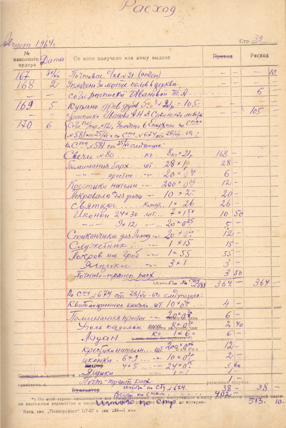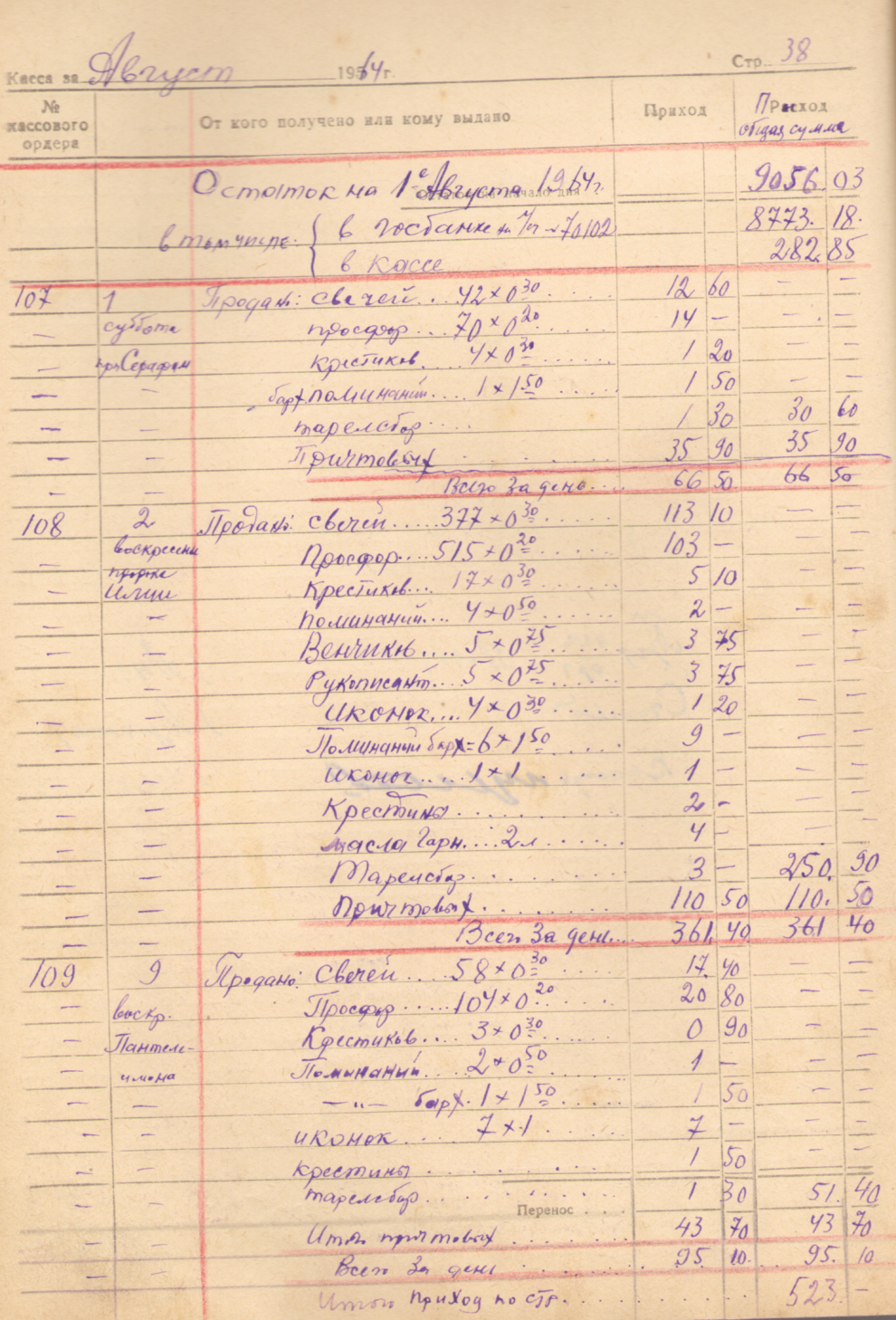 Нам удалось получить некоторые документальные свидетельства того времени. Это полугодовой отчет за 1948 год, бухгалтерский документ приходно-расходная книга за 1955-1965 годы, где четко расписан, практически, каждый день финансового состояния храма. Прибыль , в основном, складывалась от продажи свечей, просфор, масла и других церковных принадлежностей, а расходная статья позволяет отследить нужды храма и их исполнение. Данный документ также свидетельствует о ценах того времени. Кроме того выясняется, что Православная церковь вела отчисления в «Фонд Мира», платила взносы в Епархию, имела счет в Госбанке.