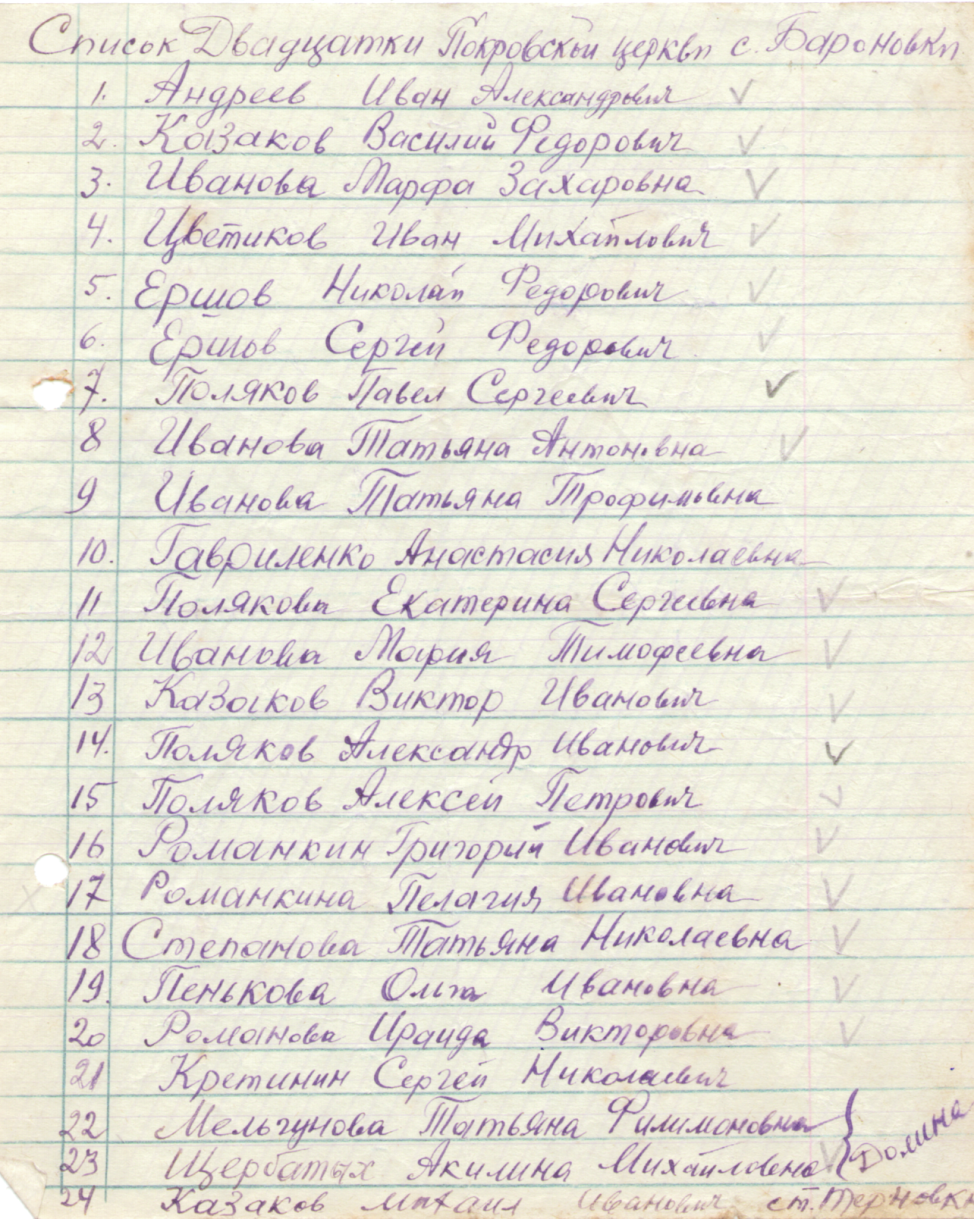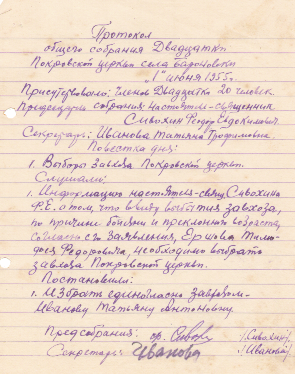 Из протоколов собрания Двадцатки ясно, что Покровская церковь подчинялась Терновскому Райисполкому. По документам видно, что настоятелем храма в это время был Сивохин Федор Евдокимович (Рис.7).