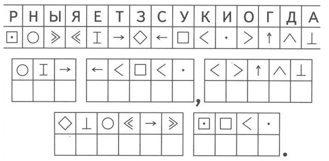 Ребята, сейчас надо будет быть очень внимательными. На листках зашифрована русская народная пословица. Вам необходимо расшифровать её. Каждой букве соответствует определённый знак.