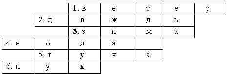 Воспитатель: У меня есть интересный кроссворд (на доску вывешивается плакат с пустыми клетками кроссворда). В красных клетках зашифровано слово, которое вы должны отгадать. Я загадаю вам загадки о явлениях природы, в пустые клетки вы впишите отгадки и узнаете зашифрованное слово.