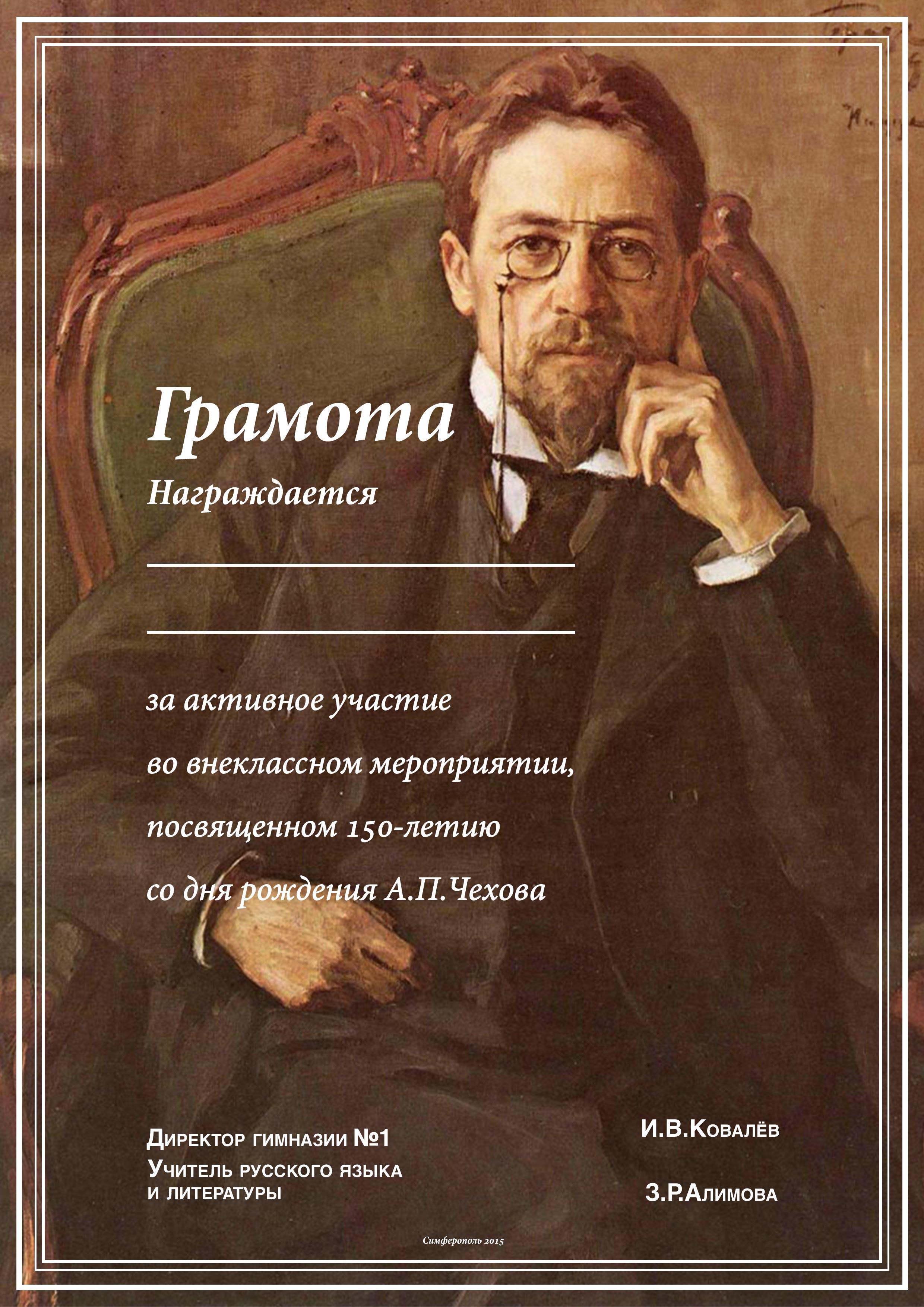 Цели: обогащение сведений о Чехове как человеке и писателе; развитие памяти и мышления учащихся; развитие умения точно и грамотно передавать состояние персонажей; воспитание интереса к творчеству А. П. Чехова; воспитание внимательного читателя, чуткого к художественному слову; формирование ценностного отношения к культурному наследию прошлого; расширение опыта творческой деятельности.