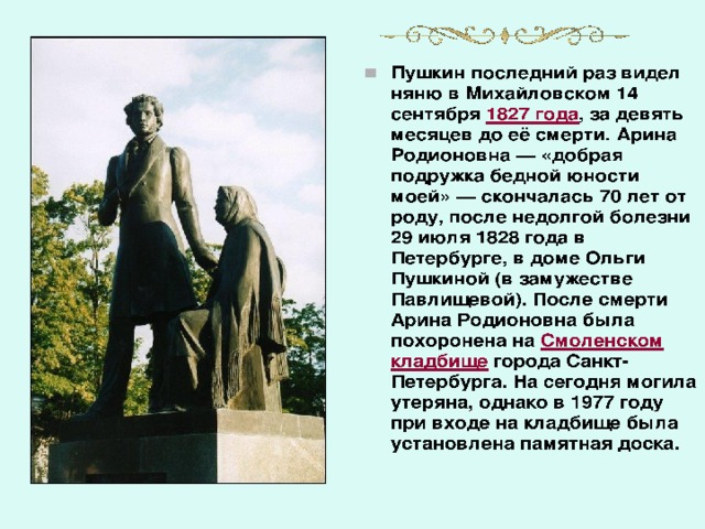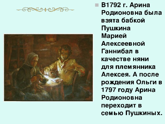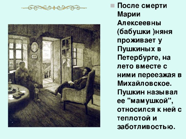 Арина Родионовна сразу стала единственным собеседником поэта, занимавшим его слух и воображение в тёмные вечера своими рассказами и сказками.
