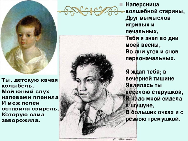 Многие сюжеты и мотивы сказочных историй, рассказанных няней, поэт использовал в своём творчестве.