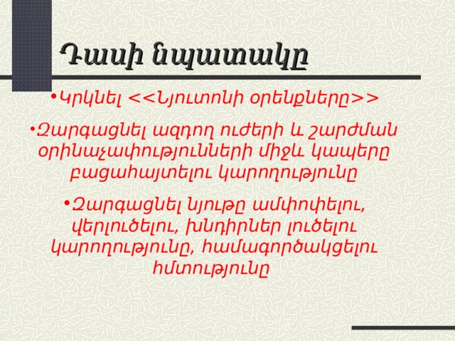 Զ արգացնել ազդող ուժերի և շարժման օրինաչափությունների միջև կապերը բացահայտելու կարողությունը Զարգացնել նյութը ամփոփելու, վերլուծելու, խնդիրներ լուծելու կարողությունը, համագործակցելու հմտությունը " width="640"