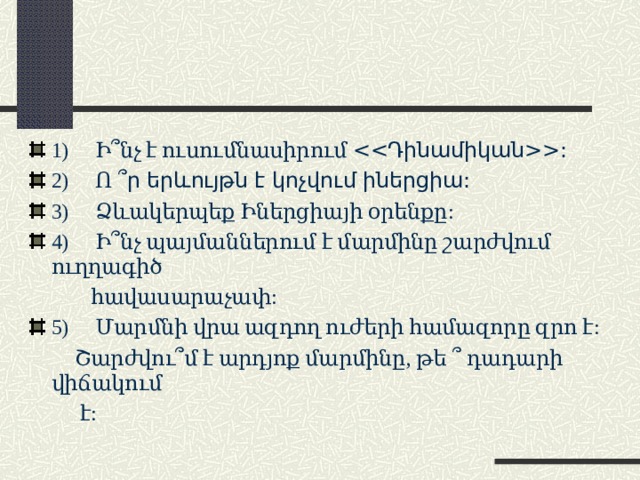 : 2) Ո ՞ ր երևույթն է կոչվում իներցիա: 3) Ձևակերպեք Իներցիայի օրենքը: 4) Ի ՞ նչ պայմաններում է մարմինը շարժվում ուղղագիծ հավասարաչափ: 5) Մարմնի վրա ազդող ուժերի համազորը զրո է: Շարժվու ՞ մ է արդյոք մարմինը, թե ՞ դադարի վիճակում է: " width="640"