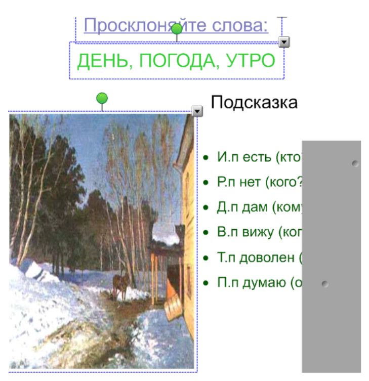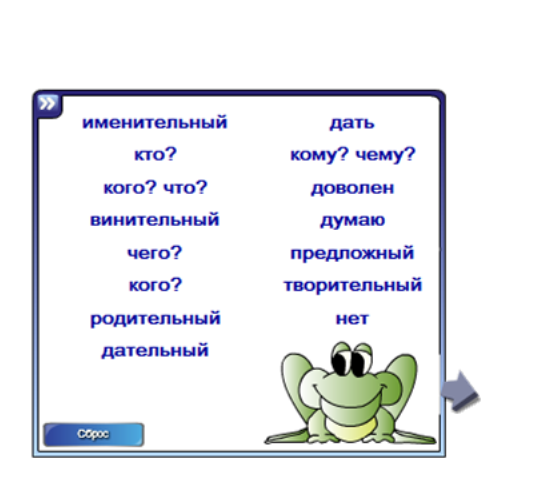 Авторские комментарии: ЦОР (цифровой образовательный ресурс) можно использовать в качестве материала для фронтальной работы со всем классом при изучении и актуализации знаний на серии уроков по темам: «Склонение имен существительных, изменение по падежам», а также в течение второй половины 3 класса и всего учебного года в 4 классе. На уроке может использоваться как один слайд, так и несколько слайдов (одна или несколько игр).