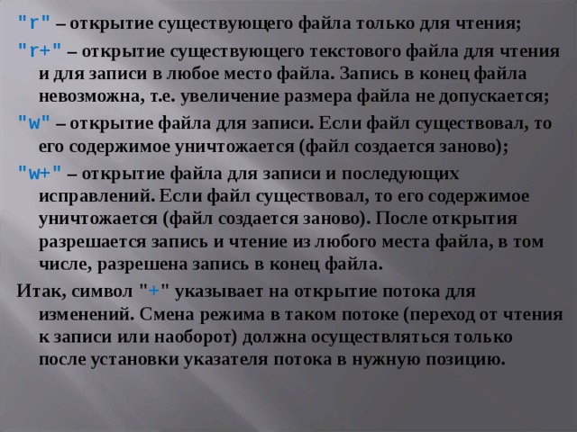 " r +" – открытие существующего текстового файла для чтения и для записи в любое место файла. Запись в конец файла невозможна, т.е. увеличение размера файла не допускается;