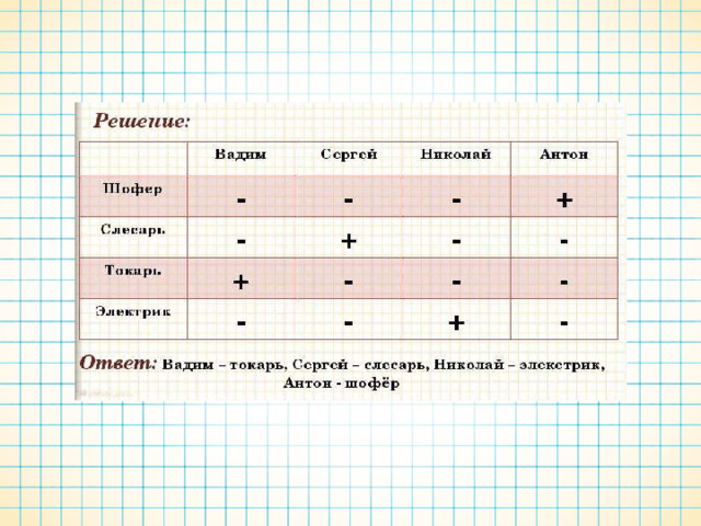 1. Составляйте таблицу, так как в таблице удаётся учесть все возможные варианты. 2. Внимательно читайте каждое утверждение, так как в каждом содержится что-то такое, что позволит вам исключить хотя бы один из вариантов. 3. Старайтесь отыскать ключевое утверждение, оно поможет развязать весь клубок. 4. После того как вы сравнили все утверждения и исключили из них те, невероятность которых была на поверхности, сравните утверждения между собой, установите связи и противоречия. 5. Решение можно найти простым методом последовательных исключений.