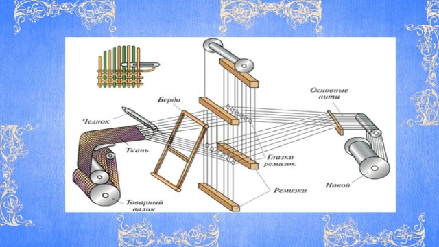 1.навой; 2. нити основы; 3.челнок; 4. нити утка; 5.кромка; 6.товарный валик.