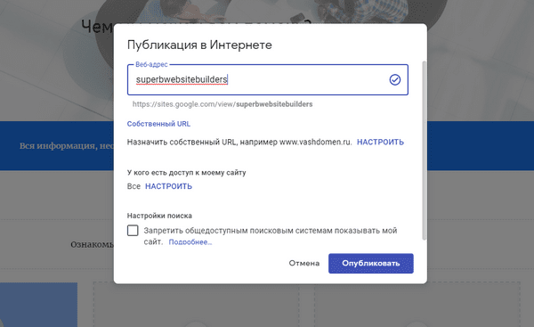 Чтобы сайт стал общедоступным, нажмите на кнопку «Опубликовать». Появится окно, в котором нужно ввести веб-адрес. Обратите внимание: вам необходимо указать только последнюю часть адреса — например, superbwebsitebuilders. Полный адрес будет https://sites.google.com/view/superbwebsitebuilders.