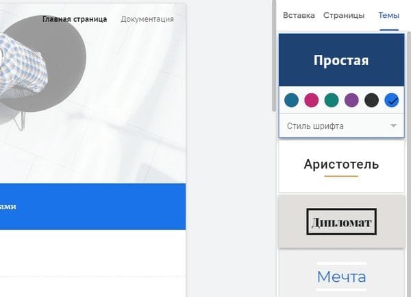 3. «Темы» — варианты оформления сайта. В редакторе есть несколько пресетов, в которых можно менять цвет подложки и стиль шрифта.