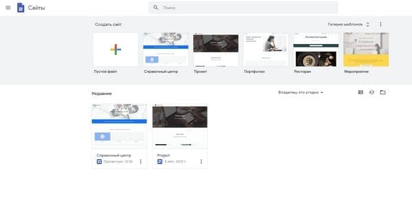 Для работы с Google Sites нужен аккаунт Google. После авторизации вы попадёте в дашборд. Дальше есть два варианта: создать сайт с нуля или воспользоваться готовым шаблоном.