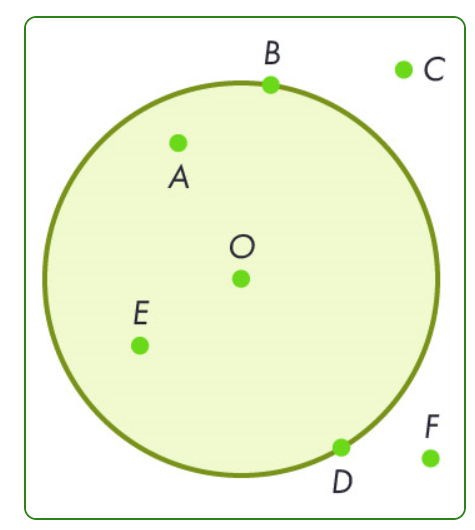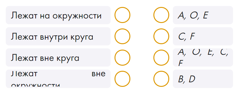 Изучи рисунок и установи соответствие между взаимным расположением точек относительно окружности и круга