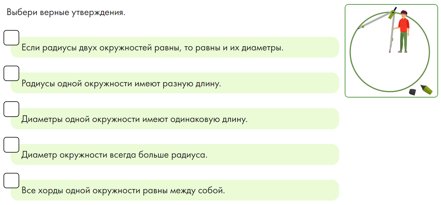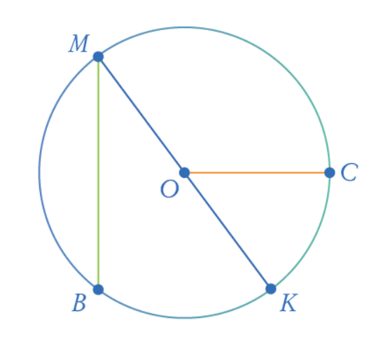 Изучи рисунок и установи соответствие между элементами окружности и их названиями