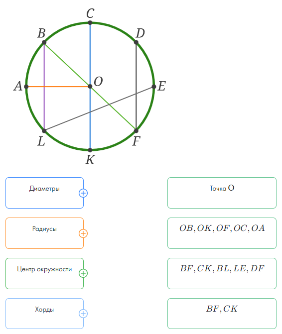 Изучи рисунок и установи соответствие между элементами окружности и их названиями.