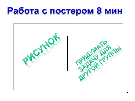 4. Закрепление прошлой темы. Учащимся раздаются постеры. На одной стороне изображают надписями или рисунками прошлую тему. На другой придумывают задачу по теме другой группе. На защиту выходят к доске.