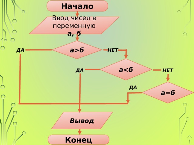 б ДА НЕТ а ДА НЕТ а=б ДА Вывод Конец " width="640"