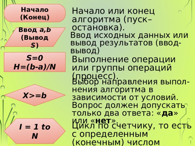 Выбор направления выпол-нения алгоритма в зависимости от условий. Вопрос должен допускать только два ответа: « да » или « нет ».