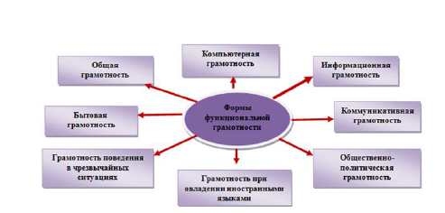 Функциональная грамотность складывается из компьютерной, информационной, коммуникативной, экономической, гражданской, общественно-политической, языковой, бытовой и общей грамотности человека.