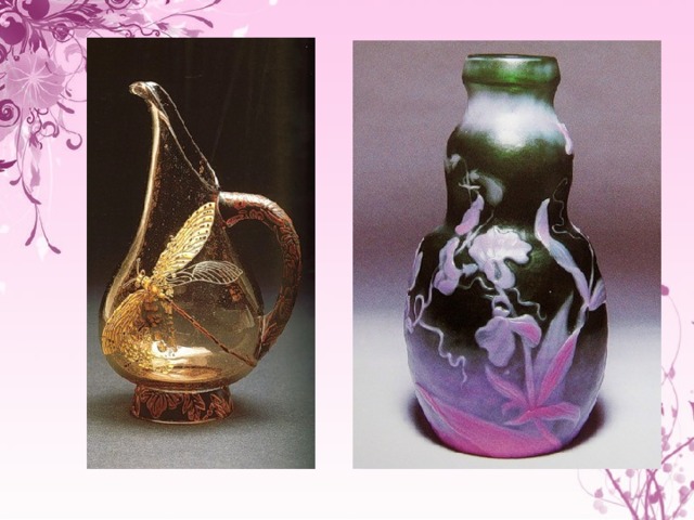 - Возрождались классические мотивы и материалы, а также редкие техники эмалирования, иризации и росписи стекла эмалями, краклэ - приемы венецианского стеклоделия эпохи Возрождения.